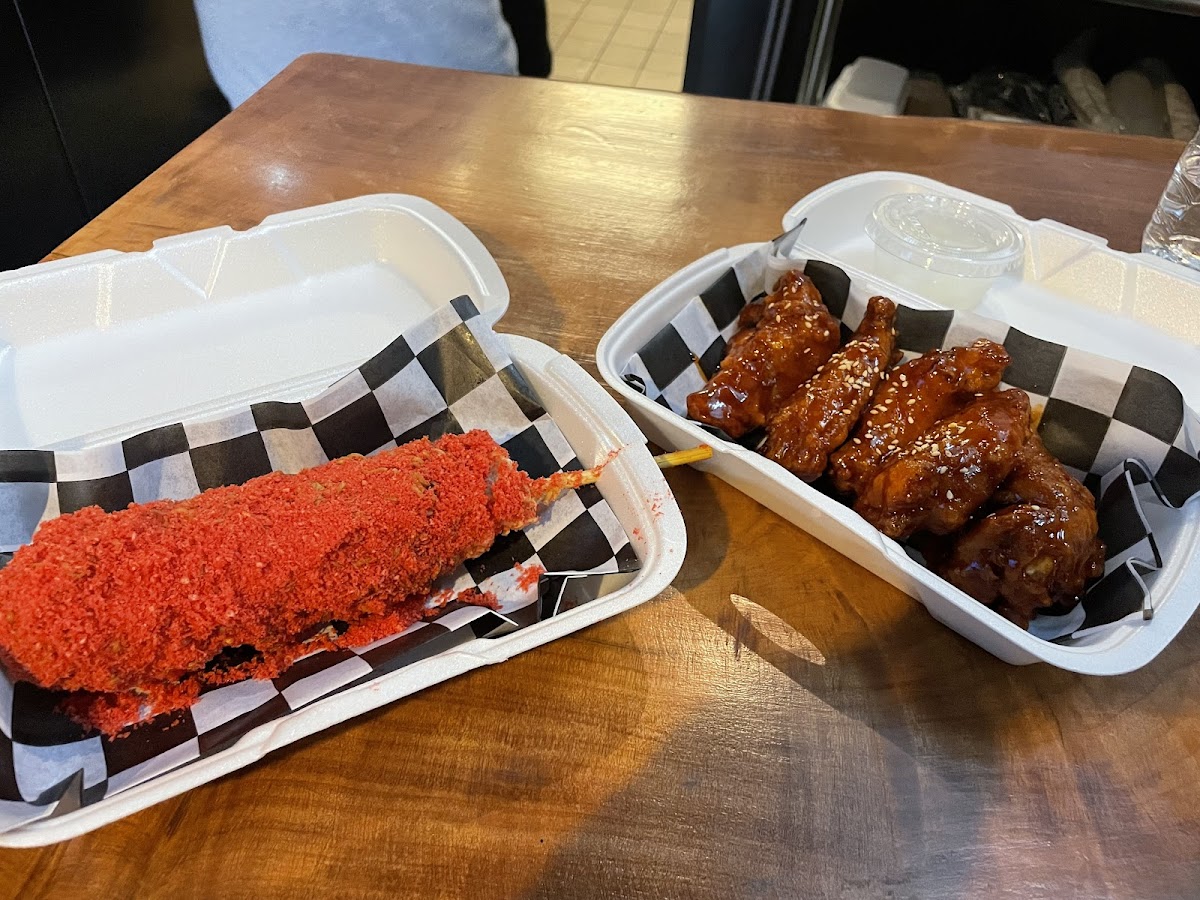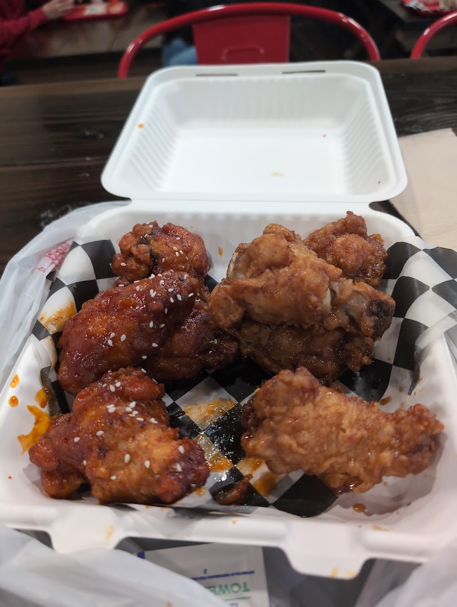 Tried this place for the first time today since I was in the mood to grab some Korean fried chicken. We grabbed the large chicken, which comes with 15 wings. We chose 3 sauces: sweet spicy, garlic breath, and ginger bbq. All of them were very good. The chicken came out piping hot and crispy. The sweet spicy sauce wasn't very spicy, but it tasted great. You can definitely taste the gochujang in the sauce. The ginger bbq was probably my least favorite of the three sauces. It was a bit too tangy for me, but still tasty. My wife and I both LOVED the garlic breath. This had great flavor and balance, and it also was light enough that it allowed the wings to retain all of their crispness throughout our meal, which wasn't the case with the others (they were still great ). Overall, we really enjoyed them. We'll be back to have them again, and probably to try the corndogs, which we didn't sample today. Definitely worth a drive down to campus.
